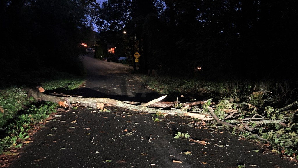 We had a downed tree on the road just outside our not-so-dead-end street yesterday. It had been pretty blustery the night before. I headed out Monday morning to do the homework kit distribution at The Boy’s school, and ran into this. It’s bigger than it looks. I do think I probably could have wrangled it out of the way, but that’s a pretty soft probably. There was a brief internal dialogue about the gritty self-reliance that could clear the mess right away and do the neighbors a service, right now, vs. driving off in the other direction and calling the government to come clean it up, eventually. I chose the latter, and still feel dirty. My strongest rationalization was that even though the area still had power, I didn’t have time to be sure that there weren’t any power lines involved in the mess. Besides, it’s just as fast (for me) to turn around and go the other way. Depending on the destination, the direction in which we leave the house is often just a matter of how we feel at the time. The victory was secured by The State on this day.